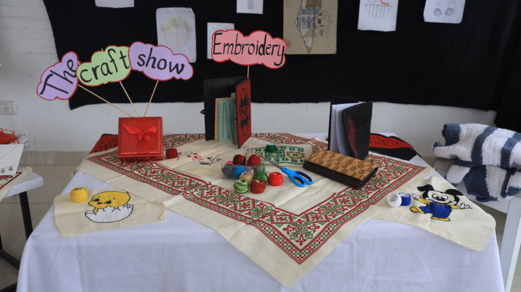 Ruba Dweik, an English teacher responsible for organizing the exhibition, explained that this activity simulates the “Craft Show” lesson in the seventh grade curriculum. The exhibition included a variety of traditional Palestinian crafts such as embroidery, pottery painting, wool knitting, henna painting, handmade accessories, and various types of painting.